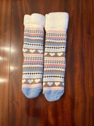 Calcetines de invierno acogedores con un diseño festivo. - Parte superior de forro polar blanco. - Patrón de rombos y corazones en rosa, azul y gris. - Puño de pelo sintético.
