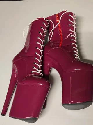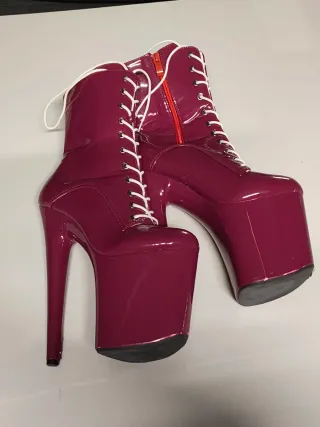 Botas de tacón alto para pole dance o estilo exótico. - Acabado brillante. - Cierre de cremallera lateral. - Cordones blancos. - Plataforma alta. IMPORTANTE: tiene signos de desgaste por rozar por el suelo (se ve en las fotos). Usado un par de meses.