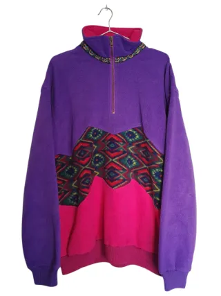 Polar de Boomerang con un diseño vibrante y llamativo. - Cuello alto con cremallera. - Panel frontal con estampado geométrico. - Combinación de colores morado y rosa intenso. Las medidas son 74 cm de largo, 60 cm de axila a axila y 63 cm de manga. Si tiene alguna duda puede consultar sin compromiso.