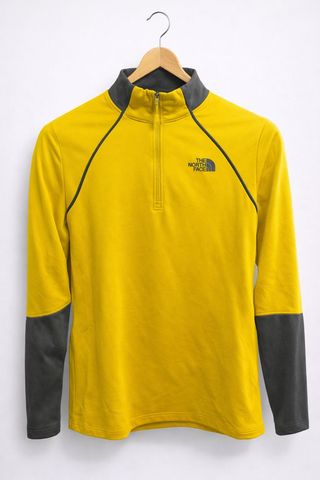 Sudadera técnica de media cremallera The North Face en color amarillo vibrante con detalles en gris. Tejido ligero y transpirable, ideal como segunda capa para montaña o para un estilo urbano. Cuenta con cuello alto y logo estampado en el pecho. Cómoda, versátil y perfecta para actividades al aire libre.