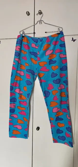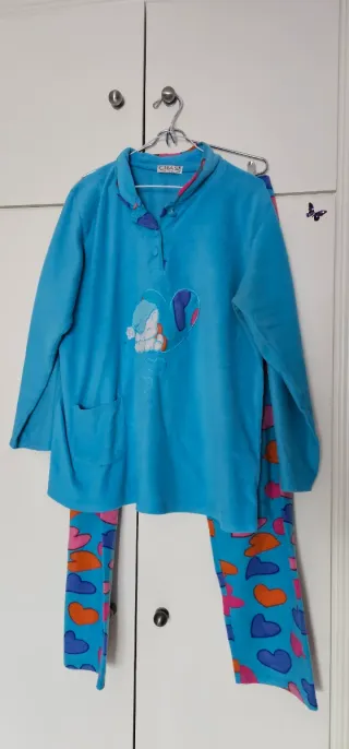 Conjunto de pijama polar de dos piezas, ideal para estar cómodo en casa. La parte superior es de color azul liso con un bolsillo y un divertido estampado de corazón con un personaje. - Parte superior de manga larga. - Pantalón con estampado de corazones multicolores.