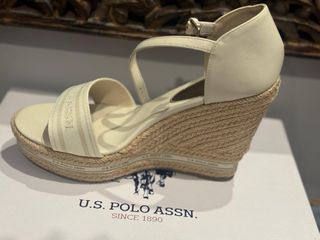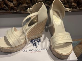 Sandalias de cuña de la marca U.S. Polo Assn usadas una sola vez -Diría que talla mas un 36 - Tira ajustable al tobillo. - Plataforma y cuña con acabado de esparto. - Detalle de logo en la tira lateral.