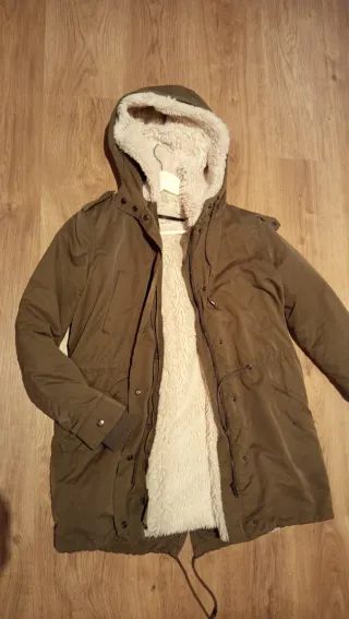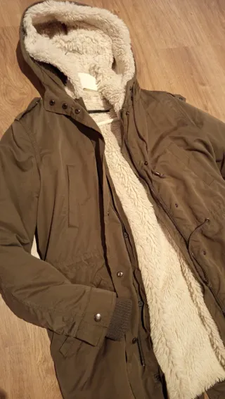 Abrigo de mujer con un cálido forro interior de pelo. - Diseño moderno y confortable. - Color beige versátil. - Marca Pull&Bear. - tiene una sola puesta.