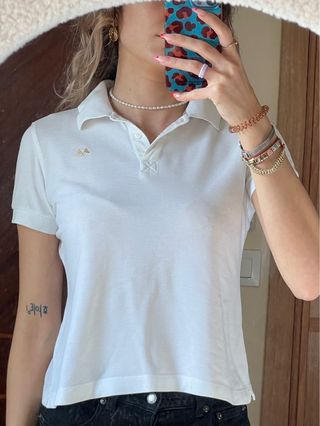 Polo de manga corta con un diseño de rayas rojas y blancas. Presenta un cuello tipo polo y cierre de botones. - Cuello con detalle de puntilla. - Logo bordado en el pecho. - Doble capa en el bajo.