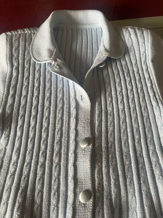 Bata de punto en color celeste, con un diseño tejido y detalles que la hacen única. - Tejido de punto con trenzas. - Cuello tipo polo. - Cierre de botones. - Incluye cinturón a juego.