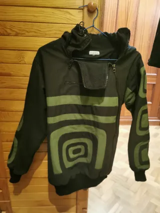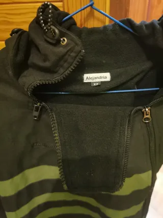 Abrigo con forro polar de la marca Alejandría. Presenta un diseño moderno con detalles en verde. - Cierre frontal con cremallera. - Capucha ajustable. - Bolsillos con cremallera.