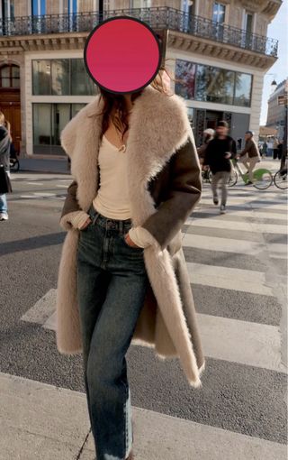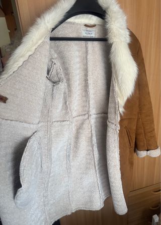 Abrigo de Bershka con un diseño moderno y cálido, perfecto para el frío. - Exterior en ante sintético color marrón. - Forro interior de pelo sintético color beige. - Cuello con pelo sintético blanco. - Bolsillos laterales.