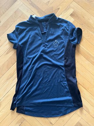 Polo de manga corta para niña, ideal para equitación. Presenta un diseño moderno con paneles laterales de malla para mayor transpirabilidad y un práctico bolsillo. - Cuello tipo polo con abertura. - Detalle de logo de caballo bordado en el pecho. - Paneles laterales de malla oscura.