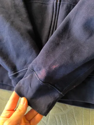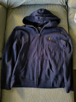 Sudadera con capucha y cremallera completa de Polo Ralph Lauren en azul marino talla 18-20 (XL). Se ve en las fotos el desgaste y la mancha en la manga de ahí el precio de la sudadera. - Logo bordado en color amarillo. - Bolsillos frontales tipo canguro. - Puños y cintura elásticos.