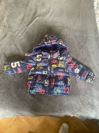 Abrigo de plumas para niño con un divertido estampado de parches y logos. Para niños entre 2 y 3 años y medio - Diseño acolchado. - Capucha integrada. - Cierre de cremallera frontal entrega en mano en Chamartin (frente a la estación)