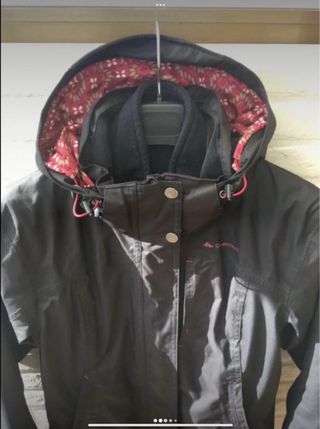 Perfecto para uso urbano o montaña. 📦Solo por envios. Abrigo impermeable de Decathlon combina funcionalidad y estilo. • Talla XS, ideal también para niñas de 14 años. • Color negro elegante con forro interior estampado en granate. • Capucha desmontable y bolsillos con cremallera, prácticos para el día a día. Incluye forro polar independiente que se ajusta por cremalleras interiores. • Diseño entallado, muy favorecedor y ligero, perfecto para viajar. • Condición: usado pocas veces, visiblemente muy bueno aunque con un ligero roce en el interior de un puño y en una esquina del cuello.
