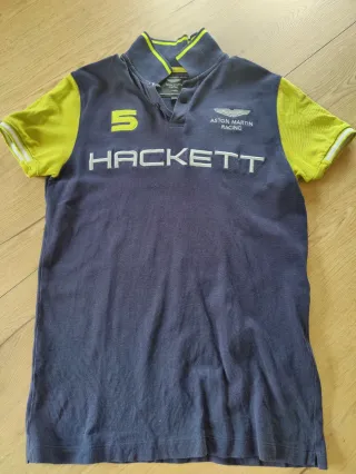 Polo de manga corta para niño de la marca Hackett. Talla 15/16 de niño o S adulto para persona delgada. Tiene una mancha en cada axila, revisar las fotos. - Diseño con el número 5 en amarillo. - Logo de Aston Martin Racing en el pecho. - Mangas de color amarillo. - Cuello tipo polo con detalles en amarillo.