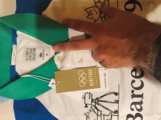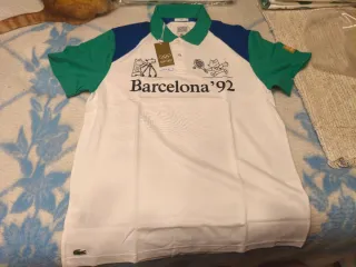 Polo Lacoste de edición especial Barcelona '92 de Lacoste. Olympic Collection Heritage - Diseño conmemorativo de los Juegos Olímpicos de Barcelona 1992. - Mangas de color verde y azul. - Parte frontal y trasera blanca. - Logo de Lacoste en la parte inferior.