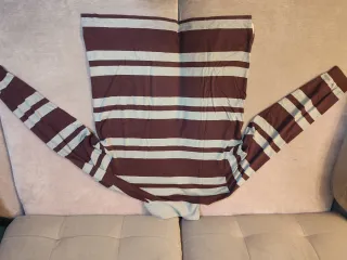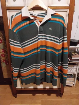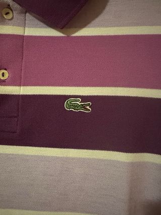 Vendo polo de manga corta y cuello en pico. Estilo retro o vintage. Talla S/M de hombre de la marca de ropa Lacoste. De color beige con detalles de rayas horizontales. En buen estado. Las medidas son: - De sisa a sisa: 57cm - Largo de la prenda: 67,5cm