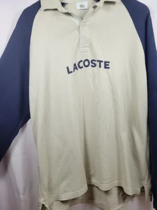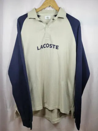 Camiseta polo vintage manga larga color beige y azul marino marca Lacoste. Talla M. No tiene ningun fallo. Medidas: Largo: 77 cm. Pecho (sin entorno): 60 cm. Hombro a hombro: 50 cm.