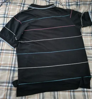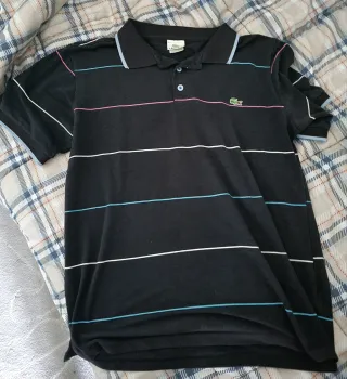 Polo sin mangas de la marca Lacoste en talla L. Presenta un diseño bicolor con detalles de rayas. - Cuello tipo polo con cremallera. - Logo de Lacoste bordado. - Ribetes en mangas y cuello. - Talla pequeña como una S