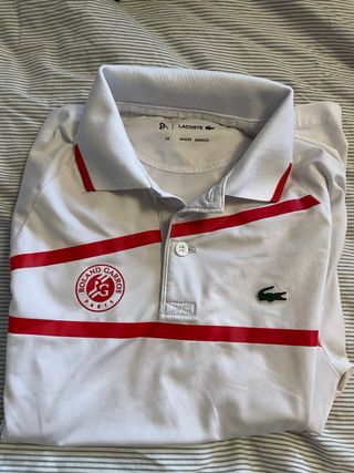 Polo de edición especial Roland Garros, diseñado en colaboración con Djokovic. Talla 14, es como una S de mujer. - Diseño con detalles en rojo. - Logo de Roland Garros y Lacoste. - Cuello tipo polo con botones.