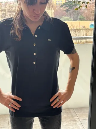 Polo Lacoste de algodón talla 38 de mujer. Entallado. Manga 3/4. Se vende porque no se utiliza. Perfecto estado. Viene con botones frontales hasta el escote. Medidas aproximadas de axila a axila 49 cm y de largo 66 cm. Precio original 120 €.