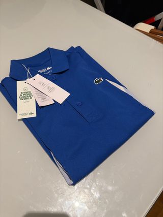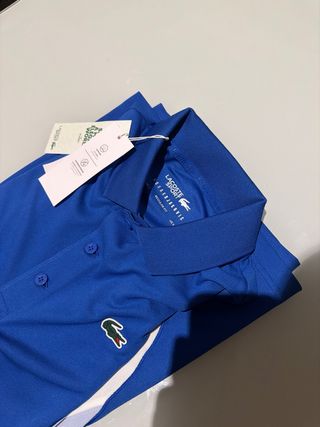 Polo de la marca Lacoste en color azul, completamente nuevo. - Logo del cocodrilo bordado en el pecho. - Cuello tipo polo con botones. - Tejido de algodón transpirable.