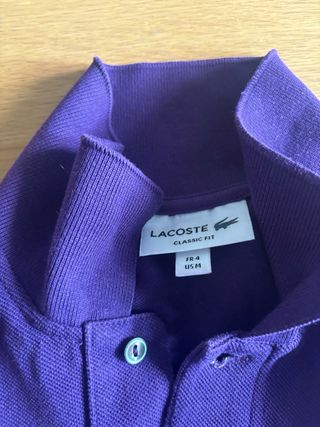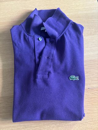 Polo de la marca Lacoste en color morado y talla M. Un clásico para tu armario. Manga larga. Se encuentra en perfecto estado. Esta prácticamente nuevo. Obviamente es original. Nuevos valen mas de 100 euros. Es tuyo por 20. NO NEGOCIABLE. - Logo del cocodrilo bordado en el pecho. - Cuello tipo polo con botones.