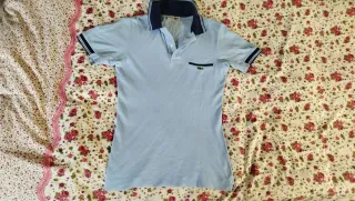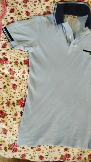 Camiseta de manga corta con cuello tipo polo y detalles en contraste. Es talla 2, (36-7), color azul clarito, es antigua pero está apenas usada y guardada mucho tiempo - Logo de la marca bordado en el bolsillo. - Cuello y puños con ribete. - Cierre de botones en el cuello.