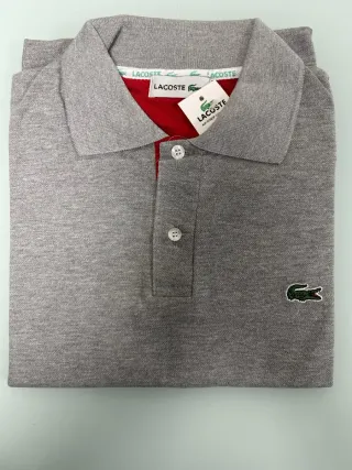 Polo de la marca Lacoste en color gris, con un toque de color rojo en el interior del cuello y en la tapeta. - Logo del cocodrilo bordado en verde en el pecho. - Cuello tipo polo. - Cierre de botones.