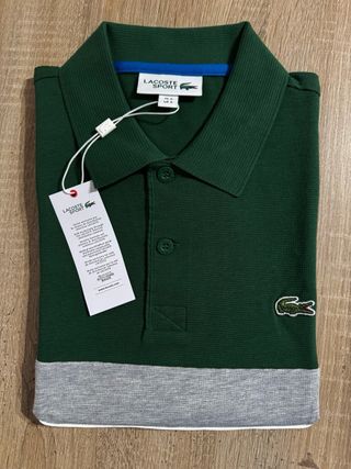 Polo de manga corta color verde oscuro de diseño de rayas nuevo a estrenar de lacoste Sport, talla 3=S para hombre - Cuello tipo polo. - Logo de cocodrilo bordado. - Rayas horizontales en gris, azul y azul marino, de preferencia entrega en madrid