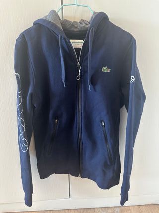 Sin estrenar. Talla S. Un nuevo estampado de pelota de tenis anima la manga de esta sudadera con capucha Lacoste Sport. Confeccionada en un cómodo tejido polar cepillado, ideal para todo tipo de atletas. Polar de mezcla de algodón cepillado Capucha con cordón Acabados acanalados y bolsillos con cremallera. Logotipo exclusivo de Novak Djokovic Transferencia de cocodrilo verde en el pecho - Bolsillos frontales con cremallera. - Logo del cocodrilo bordado. - Capucha con cordones ajustables.