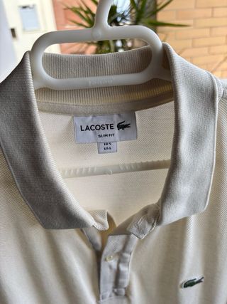 Polo de manga corta de la marca Lacoste. - Color beige. - Cuello camisero. - Cierre de botones. - Logo de la marca bordado. Se ha usado alguna vez pero está en muy buen estado.