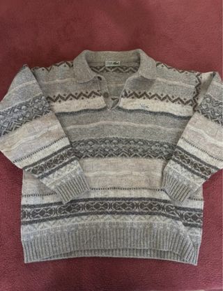 Jersey de punto de la marca Lacoste para hombre. Presenta un diseño de rayas y motivos geométricos en tonos grises y marrones. - Cuello tipo polo con botones. - Manga larga. - Tejido cálido y confortable.