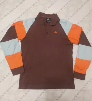 Polo de manga larga con un diseño de bloques de color. - Mangas con secciones en naranja y azul claro. - Logo de Adidas en el pecho.