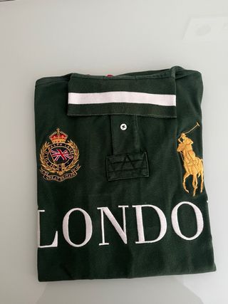 Polo de manga larga de la marca Ralph Lauren. - Color verde oscuro. - Detalle de escudo bordado en el pecho. - Logo del jinete y caballo bordado en dorado. - Inscripción LONDON en grande en la parte inferior.