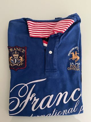 Polo de manga larga con un diseño inspirado en Francia. - Cuello con rayas rojas y blancas. - Parche bordado con el escudo de Francia. - Detalle de Tradicion del Polo Oficial con jinete. - Gran estampado France en la parte delantera.