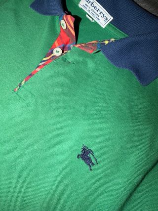 Polo de manga larga de la marca Burberry en color verde. Presenta un diseño clásico con cuello y detalles en contraste. Muy buen estado. Como nuevo. Talla M Burberry (56 cm de sisa, ver foto) - Logo de Burberry bordado. - Cuello y puños de canalé en color azul. - Cierre de botones en la parte delantera. - 100% algodón. - Diseño elegante vintage. - Tapeta con detalle de tartán Burberry.