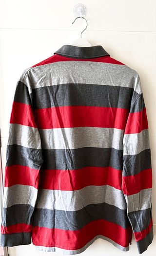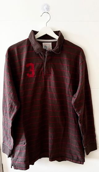 Polo de manga larga marca Springfield. Talla XXL. Color marrón con rayas rojas. Composición 100% algodón. Estilo rugby o casual, muy cómodo y en perfecto estado. • Medidas aproximadas: -Sisa a sisa: 62 cm -Largo total: 75 cm -Manga: 60 cm -Hombros: 50 cm