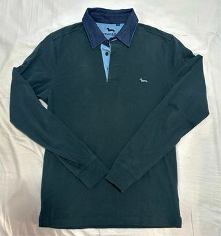 Polo de manga larga de la marca Harmont & Blaine, talla S, narrow fit (entallado) - Color verde oscuro con detalles en azul marino en el cuello. - Logo bordado en el pecho. En la foto, altura 1,79cm y peso 68kg.