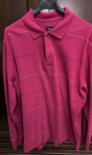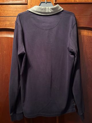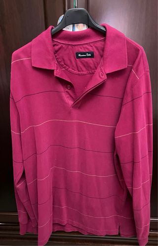 Se venden dos polos de manga larga, ambos sin estrenar y en talla M. - Diseño con franjas laterales en gris y burdeos. - Cuello tipo polo con cierre de botones. - Puños y cuello con detalles a rayas.