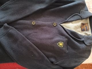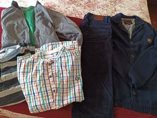 Lote de un pantalón de pana azul marino, (usado en una ocasión, con los bajos sueltos), una chaqueta de punto azul marino con bolsillos( usada tb solo en una ocasión), camisa blanca a cuadros de colores ( manga larga y usada sólo en una ocasión), cazadora reversible azul marino a rayas y por el otro lado verde Andalucía , impermeable ( también usada en una ocasión) y polo manga larga de rayas gris claro y oscuro. Todos los artículos de marca. El lote completo 25 euros. Impecable.