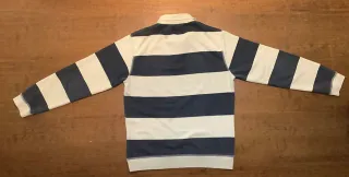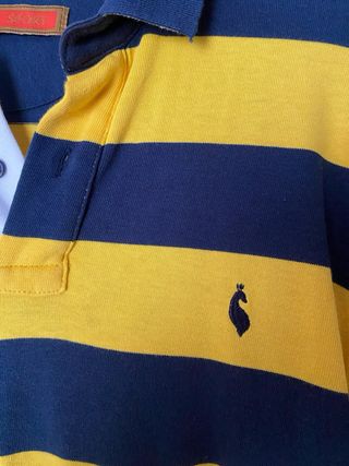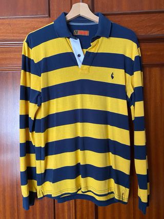 Polo de manga larga a rayas, estilo universitario. Es una prenda en buen estado. - Diseño de rayas horizontales. - Cuello tipo polo. - Color azul marino y amarillo. - Marca de Portugal (no sé cuál es) - Talla M (no pone talla pero es como una M)