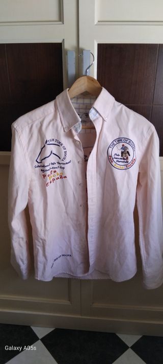 Preciosa camisa de hombre, en color rosa claro. Es de manga larga y tiene un bordado con el logo de un torneo internacional de polo. - Talla: No especificada en la imagen. - Estilo: Casual - Ideal para eventos deportivos o un look elegante.