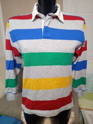 Polo de rugby con diseño de rayas horizontales. - Manga larga. - Cuello blanco. - Cierre de botones en la solapa.