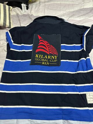 Polo de manga larga con diseño a rayas y parche de Kilarney Global Cup. - Diseño a rayas en azul, negro y blanco. - Parche bordado con el logo de Kilarney Global Cup y KLN.