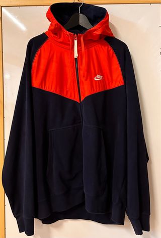 Polar con capucha de la marca Nike. Presenta un diseño bicolor con paneles en rojo y azul marino. - Cierre de cremallera completo. - Bolsillo tipo canguro. - Capucha ajustable. - No hago envíos.