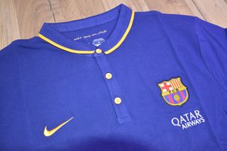Polo del FC Barcelona, de la marca Nike. Es de color azul oscuro y talla XL. Está en buen estado, aunque presenta un ligero desgaste por el uso. Es oficial como el que tenían los jugadores o entrenadores del club.
