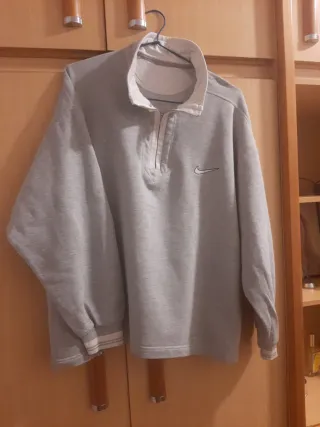 Sudadera Nike original, gris con cuello tipo polo y media cremallera. - Logo de Nike bordado en el pecho. - Puños y bajo elásticos. - Cuello con forro blanco.