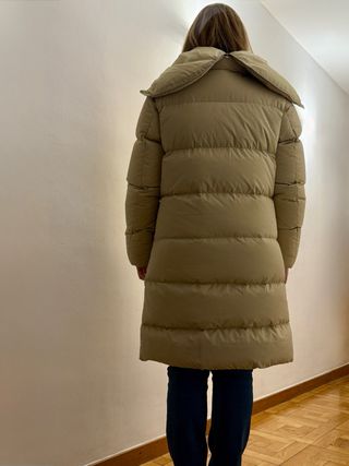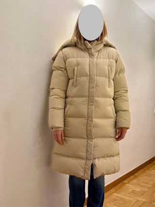 Abrigo de plumas Nike, largo, con capucha, beige, Talla 44-46 - 100% poliéster con relleno de plumas (72% plumón / 28% plumas) - 4 bolsillos frontales, los 2 inferiores con cremallera y todos forrados con tejido polar fleece - Bolsillo interior con cremallera - Cierre frontal con botones a presión y cremallera completa de dos direcciones - Puño interior elástico - Curiosa capucha con cremallera para disminuir el volumen