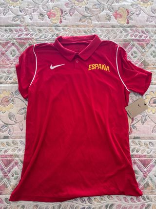 Polo de España con el logo de Nike. - Diseño en color rojo. - Inscripción ESPAÑA en la parte delantera. - Detalles blancos en los laterales.