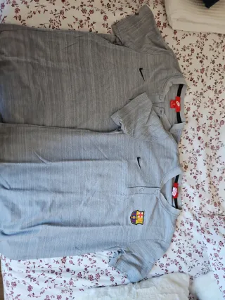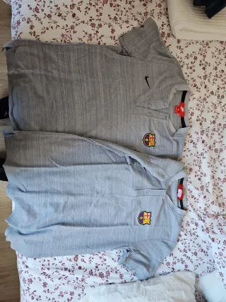 Conjunto de dos polos grises de la marca Nike, con detalles del FC Barcelona. - Logo de Nike bordado. - Escudo del FC Barcelona bordado en uno de los polos. - Cuello tipo polo con botones.
