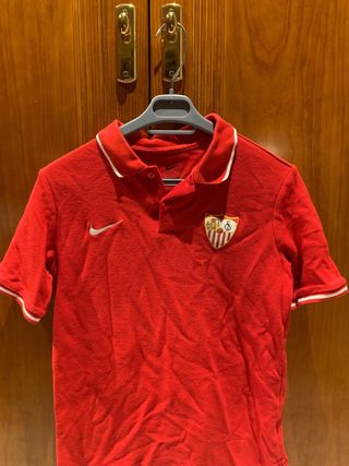 Polo del Sevilla FC, de la marca Nike. Está impecable, sin señales de uso. - Talla de niño 137-147 cm - Cuello y mangas con ribetes negros. - Escudo del Sevilla FC bordado en el pecho.