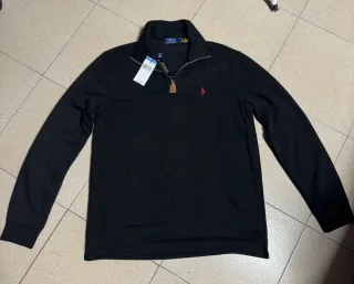 Chaqueta de Polo Ralph Lauren con cuello alto y media cremallera. SOLO HAGO ENVIOS 📦📦 - Color negro. - Logo de caballo bordado en rojo en el pecho. - Cremallera metálica. - Puños y bajo elásticos.
